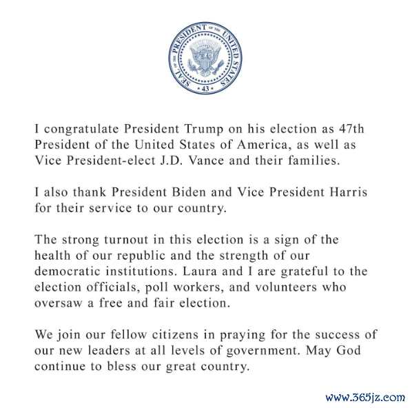 当地时间11月6日,美国前总统乔治·W·布什(小布什)发文祝贺特朗普及其竞选搭档万斯当选美国总统及副总统。小布什说正规股票配资官网,感谢美国现任总统拜登和副总统哈里斯为国家所做的贡献,将与全体美国公民一道为政府中各级新领导人的成功祈祷,“愿上帝继续保佑我们伟大的国家”。